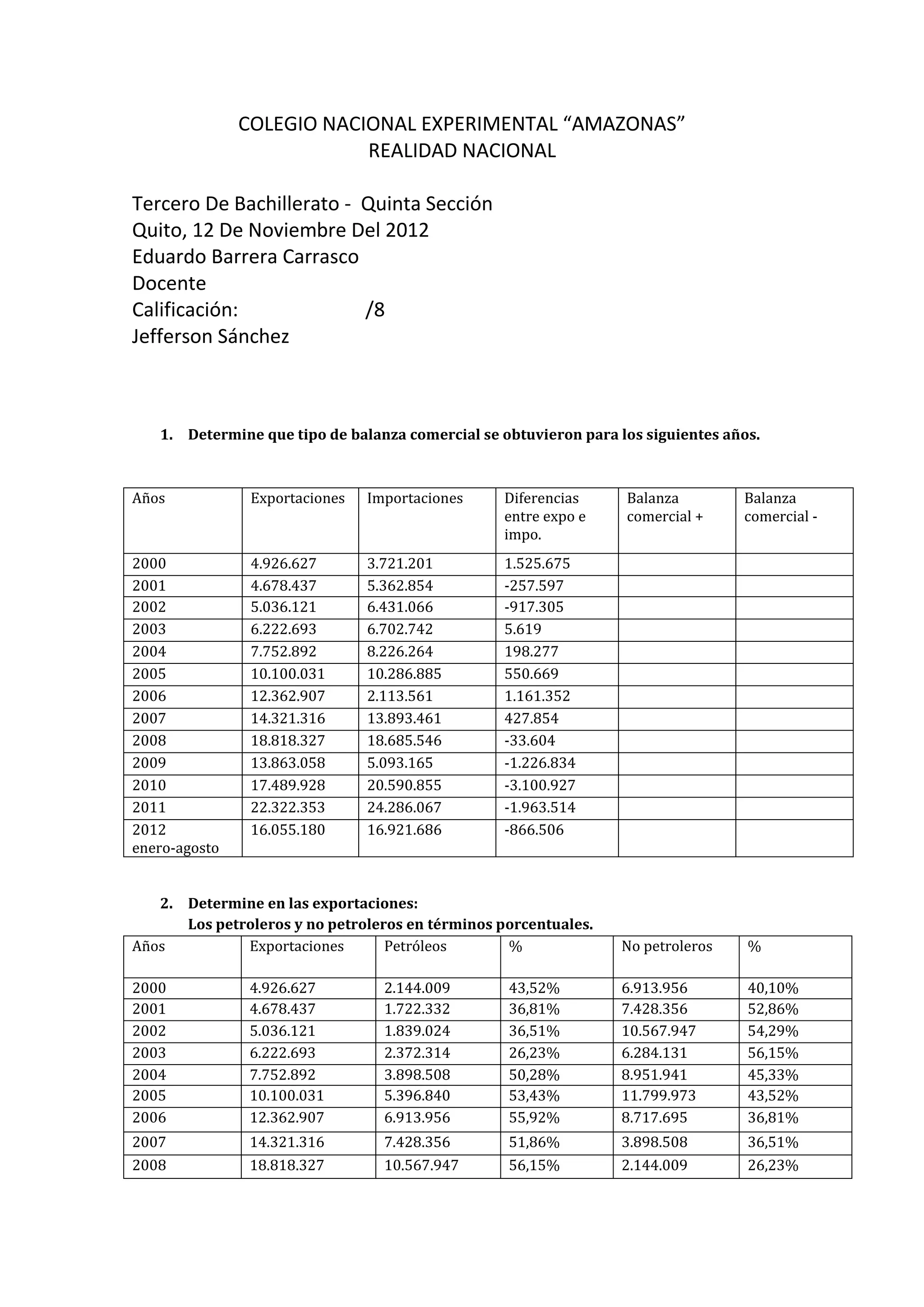 Este documento presenta datos estadísticos sobre el comercio exterior de Ecuador entre los años 2000-2012. Incluye tablas que muestran las exportaciones e importaciones anuales, la balanza comercial, la participación de petróleo vs. no petróleo en las exportaciones, los principales productos no petroleros de exportación y las importaciones clasificadas por uso económico. Adicionalmente, pide graficar la participación porcentual de las importaciones por uso en 2005 y 2010.