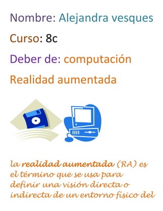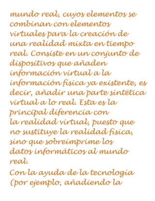 El documento habla sobre la realidad aumentada. Define la realidad aumentada como la visión directa o indirecta del mundo real combinada con elementos virtuales en tiempo real. Explica que la realidad aumentada añade información virtual a la información física existente, a diferencia de la realidad virtual que sustituye el mundo real. También menciona dos definiciones comúnmente aceptadas de la realidad aumentada.