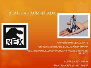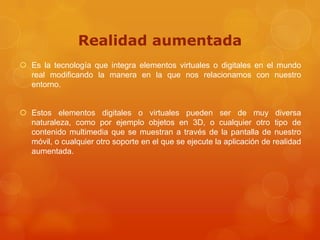 La realidad aumentada integra elementos virtuales en el mundo real, modificando cómo nos relacionamos con nuestro entorno. Requiere ordenador, software, cámara y marcadores. En educación, puede hacer aprendizaje más lúdico al aportar nuevas formas de interactuar con contenidos. Se proponen ejemplos como explicar cómo crece una planta o trabajar cuentos con realidad aumentada.