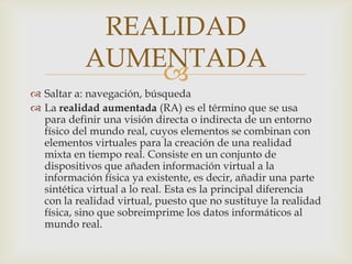 La realidad aumentada (RA) combina elementos virtuales con el mundo real de forma interactiva y en tiempo real. Consiste en añadir información virtual a la información física existente sin sustituir la realidad. Existen dos definiciones comúnmente aceptadas: la de Azuma que describe la RA como una combinación de lo real y virtual en 3D e interactiva en tiempo real, y la de Milgram que la sitúa en un continuo entre lo real y lo virtual puro. La RA funciona mediante el uso de cámaras, software y marcadores para identificar imágenes y present