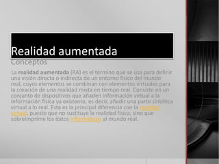 Este documento define la realidad aumentada y describe su historia y aplicaciones. La realidad aumentada combina elementos virtuales con el mundo real en tiempo real, a diferencia de la realidad virtual que sustituye completamente el mundo real. Se describen las primeras aplicaciones de realidad aumentada en los años 60 y su evolución hasta aplicaciones móviles actuales. Finalmente, se resume brevemente la historia tecnológica de la realidad aumentada desde sus orígenes hasta el desarrollo reciente de gafas inteligentes.