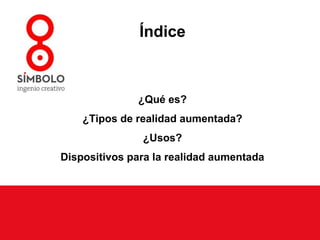 La realidad aumentada combina elementos virtuales con el mundo real en tiempo real. Existen dos tipos principales: basada en marcadores, que reconoce imágenes o códigos para superponer datos, y basada en localización, que usa GPS, brújula y acelerómetro para identificar lo que se ve y recibir información relacionada de Internet. Los dispositivos de realidad aumentada contienen una pantalla, cámara, software de realidad aumentada y capacidad de procesamiento para ver el resultado de combinar lo real y lo virtual.
