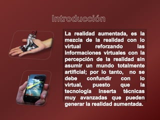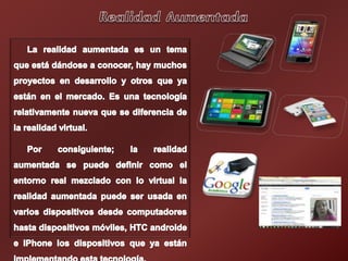 Este documento describe los componentes básicos de la realidad aumentada. Estos incluyen el monitor del computador que muestra el mundo real y virtual combinados, la cámara web que captura información del mundo real para el software de realidad aumentada, y el software que integra los datos reales y los transforma en una experiencia de realidad aumentada interactiva usando marcadores físicos.