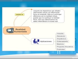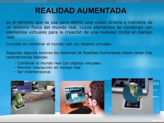 La realidad aumentada combina el mundo real con objetos virtuales de forma interactiva y en tiempo real. Requiere hardware como un headset y software para registrar imágenes del mundo real y fusionarlas con imágenes 3D virtuales. Existen aplicaciones educativas que usan marcadores para mostrar información sobre objetos o lugares históricos superpuesta en el mundo real.
