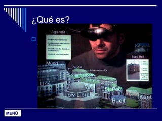 La realidad aumentada consiste en superponer información virtual al mundo real en tiempo real mediante dispositivos como pantallas en la cabeza o en la mano. El software registra imágenes del mundo real y fusiona elementos virtuales utilizando técnicas de visión por computadora, mientras que el hardware incluye cámaras, sensores y procesadores potentes. Las aplicaciones van desde la educación y la cirugía hasta el entretenimiento y la publicidad.