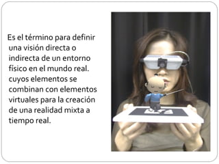 La realidad aumentada combina elementos virtuales con el mundo real para crear una realidad mixta en tiempo real, añadiendo información virtual a la información física existente en lugar de sustituir la realidad física, y convirtiendo la información del mundo real alrededor del usuario en interactiva y digital con la ayuda de la tecnología como la visión por computadora y el reconocimiento de objetos. La investigación de la realidad aumentada explora la aplicación de imágenes generadas por ordenador en tiempo real a secuencias de video para ampliar el mundo real, incl