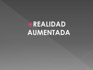 La realidad aumentada (RA) combina información real y virtual en tiempo real a través de dispositivos tecnológicos. La RA superpone datos digitales sobre el mundo físico sin reemplazarlo, permitiendo presentar información visualmente al usuario. Se aplica en campos como el turismo, donde las aplicaciones pueden identificar lugares y mostrar datos e imágenes sobre monumentos u objetos.