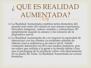 El documento define la realidad aumentada como la combinación del mundo real y virtual en una misma experiencia interactiva, permitiendo a los usuarios descubrir información adicional al enfocar objetos o lugares con la cámara de su dispositivo móvil. Explica que la realidad aumentada permite a las empresas interactuar con clientes de nuevas formas y hacer que el empaquetado de productos cobre vida. Finalmente, describe algunos usos prácticos como identificar lugares y obtener información turística o encontrar un coche olvidado en un estacionamiento.