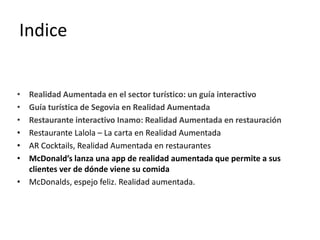 Este documento presenta varios ejemplos de cómo la realidad aumentada se está aplicando en el sector del turismo y la restauración, incluyendo guías turísticas interactivas, menús de restaurantes con realidad aumentada que muestran información sobre los platos, y aplicaciones que permiten a los clientes ver de dónde provienen los ingredientes de sus comidas.