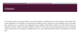 La Realidad Aumentada complementa la percepción del mundo real con información virtual superpuesta. Se aplica en áreas como la educación, el patrimonio histórico y el marketing. A diferencia de la realidad virtual, la Realidad Aumentada no sustituye el mundo real sino que añade información virtual manteniendo el contacto con el entorno. Existen diferentes niveles y tipos de Realidad Aumentada que se aplican en distintos dispositivos como gafas, teléfonos y consolas de videojuegos.