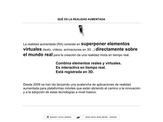 La realidad aumentada consiste en superponer elementos virtuales sobre el mundo real para crear una realidad mixta en tiempo real. Se han lanzado muchas aplicaciones de realidad aumentada para móviles desde 2009 que están abriendo el camino a la innovación y adopción masiva de estas tecnologías. Algunos sectores como el marketing, comercio electrónico, simulación, ocio y entretenimiento, cultura, turismo y educación están sacando provecho de la realidad aumentada.