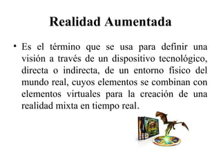 Este documento describe la realidad aumentada y sus técnicas de visualización, funcionamiento y usos prácticos. La realidad aumentada combina elementos virtuales con el mundo real en tiempo real a través de dispositivos como pantallas en la cabeza, de mano o espaciales. Funciona capturando imágenes reales y procesando y posicionando con precisión elementos virtuales superpuestos utilizando marcadores, geoposicionamiento o reconocimiento de objetos. Sus usos incluyen educación, turismo, medicina, publicidad y entretenimiento.