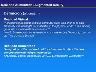 La realidad aumentada (RA) integra información digital en el mundo real. Se originó en los años 1960 y se utiliza en aplicaciones como medicina, manufactura, entrenamiento, arquitectura y educación. La RA combina lo real con lo virtual en tiempo real a través del reconocimiento y seguimiento visual para mejorar el mundo físico con información digital.