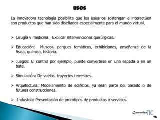 La realidad aumentada es una tecnología que superpone información virtual sobre elementos físicos o escenarios naturales existentes, a diferencia de la realidad virtual que sustituye todos los elementos por virtuales. Se usa en cirugía, educación, juegos, simulaciones, arquitectura e industria. Requiere un dispositivo móvil con cámara, un plano físico y el software D.A.R.T., el cual proporciona herramientas para coordinar objetos 3D, video, sonido e información de seguimiento para mezcl