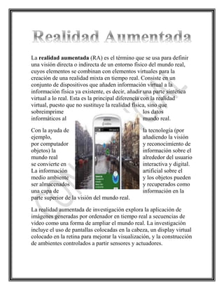 El documento habla sobre el uso creciente de la realidad aumentada en la educación, donde se superponen elementos virtuales sobre el mundo real para enseñar de manera más interactiva, aprovechando tecnologías como la visión por computadora.