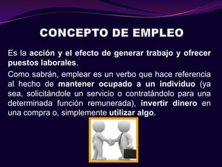 El documento discute los tipos de empleo y desempleo. Explica que históricamente la esclavitud vinculó a las personas a través del trabajo, pero que actualmente la forma más extendida es el trabajo asalariado formal e informal. También describe los cuatro tipos principales de desempleo - estructural, cíclico, friccional y estacional - y sus características. Finalmente, señala que el desempleo representa problemas económicos y sociales significativos para los trabajadores y la sociedad.