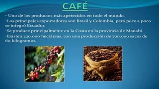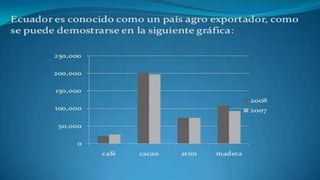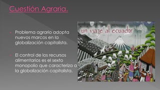El documento analiza el contexto agrario y económico del Ecuador en el marco de la globalización capitalista, destacando el control de recursos alimentarios y políticas de uso de la tierra. Se mencionan diversas formas de propiedad de tierras y cultivos, así como la importancia de fortalecer el sector agroalimentario y fomentar la soberanía alimentaria. También se aborda la situación de las pequeñas y medianas empresas, el sector informal y las políticas de biocombustibles en el país.