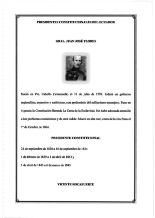 Este documento presenta una lista de los presidentes constitucionales del Ecuador desde la independencia hasta 1916. Cada entrada incluye las fechas de su presidencia, lugar y fecha de nacimiento y muerte, y breves detalles sobre logros y acontecimientos durante su mandato.