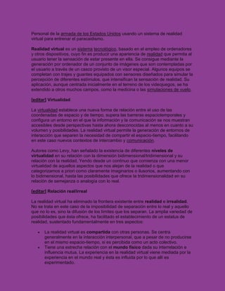 La realidad virtual permite crear entornos virtuales tridimensionales mediante el uso de cascos y guantes que simulan la experiencia sensorial de estar presente en dichos entornos. Estos entornos virtuales se usan cada vez más en aplicaciones como el entrenamiento militar, la medicina y los videojuegos. La realidad virtual elimina la frontera entre lo real y lo irreal al permitir compartir experiencias virtuales que influyen en el mundo físico y facilitan la experimentación con identidades múltiples.