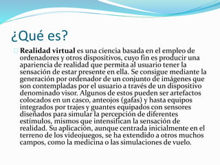 La realidad virtual permite crear entornos virtuales tridimensionales que generan la ilusión de estar presente en ellos. Puede ser inmersiva mediante el uso de visores como cascos o gafas, o no inmersiva a través de una interfaz de escritorio. Aunque inicialmente se usó para videojuegos, ahora también se aplica en medicina, simulaciones de vuelo y otros campos. La realidad virtual difumina los límites entre lo real y lo virtual al permitir compartir experiencias en entornos virtuales y experimentar identidades múltiples.
