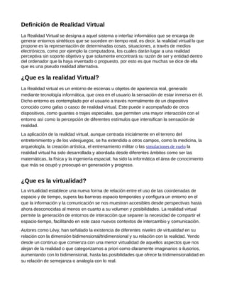 La realidad virtual genera entornos sintéticos que representan determinadas situaciones a través de medios electrónicos como computadoras, creando una realidad perceptiva sin soporte objetivo. Se usa en educación, entrenamiento militar y médico, permitiendo practicar habilidades de forma segura. La realidad virtual puede ser inmersiva usando cascos y guantes, o no inmersiva a través de una pantalla. Tiene aplicaciones en varios campos como educación, entrenamiento, y medicina.