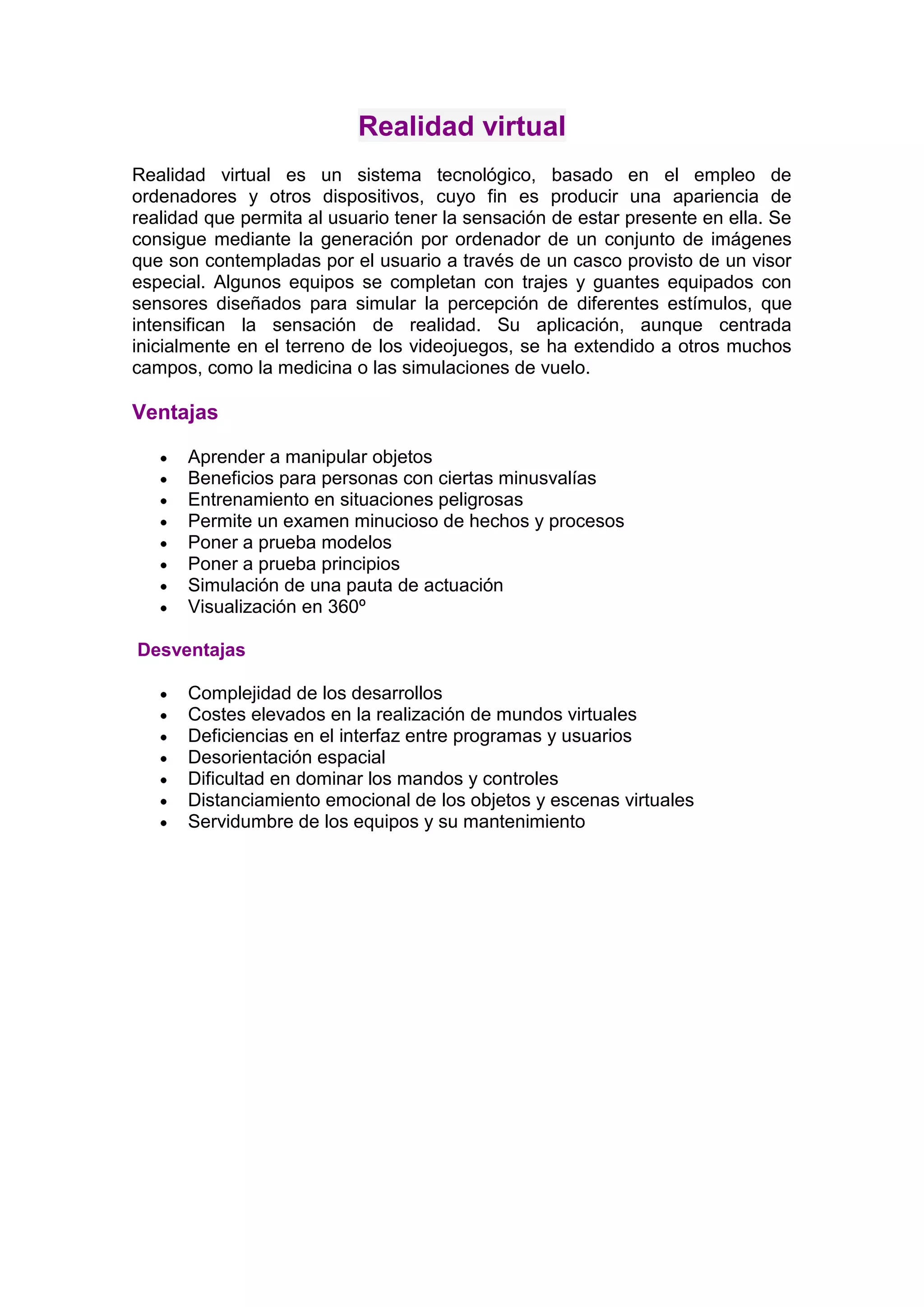 La realidad virtual es un sistema tecnológico basado en ordenadores que produce una apariencia de realidad permitiendo al usuario sentirse presente a través de imágenes generadas por ordenador y visibles a través de un casco. Algunos equipos incluyen trajes con sensores para simular estímulos y aumentar la sensación de realidad. Aunque inicialmente se usó en videojuegos, ahora se aplica en medicina, simulaciones de vuelo y otros campos.