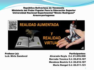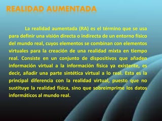 Este documento presenta información sobre la realidad aumentada y la realidad virtual. Define la realidad aumentada como la combinación de elementos virtuales con el mundo real en tiempo real sin sustituir la realidad física. Explica que la realidad virtual crea mundos simulados por computadora donde los usuarios pueden interactuar de forma inmersiva. Finalmente, destaca que la diferencia principal entre ambas es que la realidad aumentada se superpone a la realidad física, mientras que la realidad virtual sustituye completamente el mundo real.
