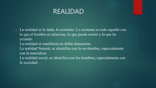 Este documento discute la realidad y el conocimiento. Define la realidad como aquello que se nos presenta en nuestra experiencia de forma directa e inteligible, y argumenta que determinar qué es real ha sido objeto de debate a lo largo de la historia. También explora el concepto de conocimiento como un conjunto de información adquirida a través de la experiencia, el aprendizaje o la introspección, y cómo la ciencia considera que el conocimiento científico debe ser probado mediante el método científico.