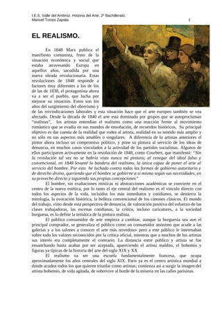 El documento describe el surgimiento del movimiento artístico del realismo en Europa en la década de 1840. Se presenta a tres de sus principales exponentes: Courbet en Francia, conocido por obras que retrataban la vida rural y obrera; Millet, quien también se enfocó en la temática campesina; y Daumier, conocido por sus caricaturas políticas y retratos de la vida urbana. El realismo se caracterizó por intentar reflejar la realidad de una manera más directa y comprometida social y políticamente, alejándose
