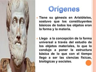 El realismo sostiene que la realidad existe independientemente de la mente y puede ser conocida. Tiene sus orígenes en las ideas de Aristóteles sobre la forma y la materia. El método educativo realista enfatiza la enseñanza de hechos del mundo físico a través de la percepción sensorial para que los estudiantes comprendan las leyes naturales. El rol del maestro es proveer información precisa sobre la realidad de forma eficiente, mientras que el currículo se enfoca en materias basadas en la naturaleza y las matemá
