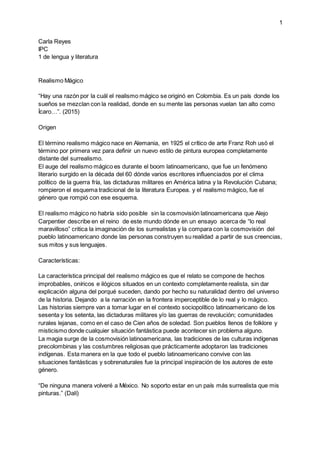 El realismo mágico surgió en América Latina en la década de 1960 influenciado por el clima político de la época y la cosmovisión latinoamericana. Se caracteriza por narrativas que tienen lugar en contextos rurales latinoamericanos y presentan hechos mágicos o sobrenaturales descritos de manera realista, sin explicación. Autores emblemáticos incluyen a Gabriel García Márquez, Jorge Luis Borges, Julio Cortázar y Alejo Carpentier.