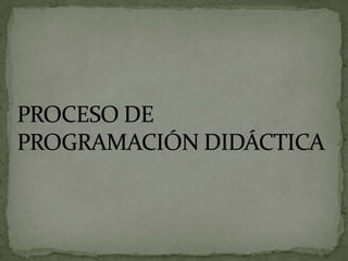 El documento describe los pasos del proceso de programación didáctica, incluyendo la organización metodológica, la motivación de los estudiantes, y progresar de lo más fácil a lo más difícil. También cubre la planificación de actividades por el profesor, con objetivos concretos para cada sesión, y la definición, formulación y evaluación de objetivos de aprendizaje.