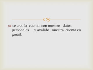 El documento describe los pasos para crear una cuenta de Gmail y un blog en Blogger.com. Luego explica las diferentes opciones disponibles en un blog como agregar nuevas entradas, ver estadísticas, comentarios, diseño y plantillas. Finalmente, menciona cómo crear una cuenta en Slideshare.com para subir documentos al blog.