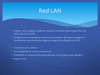 Un documento describe las ventajas de configurar una red local (LAN) entre varios equipos, incluyendo la transferencia de archivos, el uso compartido de recursos como impresoras, y la comunicación entre equipos alejados. Explica que existen dos tipos principales de redes LAN: redes BNC que usan cable coaxial y son sencillas pero limitadas, y redes RJ45 que usan cable RJ45, son más rápidas, seguras y flexibles, pero requieren tarjetas de red, cables, y un concentrador para conectar los equipos.