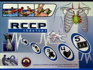 Este documento proporciona instrucciones sobre la Reanimación Cardio Cerebro Pulmonar (RCCP) Básica. Explica la cadena de supervivencia ABCDE que incluye: A) despejar la vía aérea, B) ventilaciones de rescate, C) masaje cardíaco externo, D) desfibrilación temprana y E) atención médica de emergencia. Detalla las técnicas específicas para cada paso, incluida la posición correcta, la frecuencia y la relación entre masajes y ventilaciones. Tamb