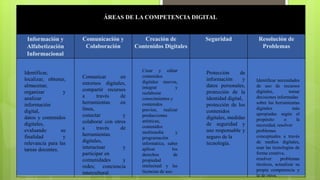 El documento describe las áreas de la competencia digital que incluyen información y alfabetización informacional, comunicación y colaboración, creación de contenidos digitales, seguridad y resolución de problemas. Para cada área, se pide que se describa un ejemplo de cómo desarrollar esa competencia en una actividad de clases.