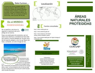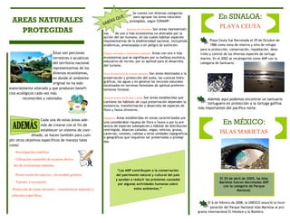 Este documento proporciona información sobre las áreas naturales protegidas en México. Describe las diferentes categorías de áreas protegidas, como parques nacionales, reservas de la biosfera y santuarios. También menciona algunas áreas protegidas específicas en México, como Playa Ceuta en Sinaloa y las Islas Marietas, y explica brevemente sus objetivos de conservación.