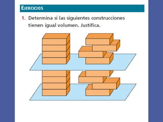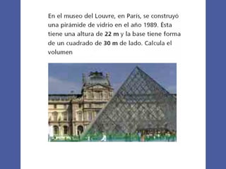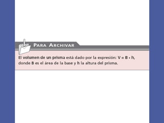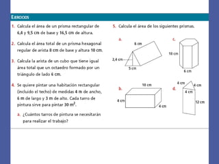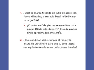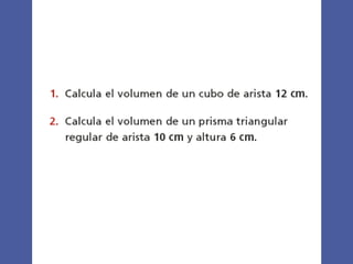 El documento trata sobre el cálculo del área y volumen de cuerpos geométricos. Explica cómo calcular las medidas de figuras como cuadrados, rectángulos, triángulos, círculos y esferas.