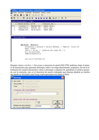 Este documento explica cómo usar la base de datos bibliográfica REBECA para extraer registros y añadirlos al catálogo automatizado ABIES. Los registros de REBECA se pueden descargar gratuitamente mediante un programa o en la web de REBECA e importar al depósito auxiliar de ABIES. El documento proporciona instrucciones detalladas sobre cómo realizar búsquedas en REBECA, descargar los registros y convertirlos al formato aceptado por ABIES.
