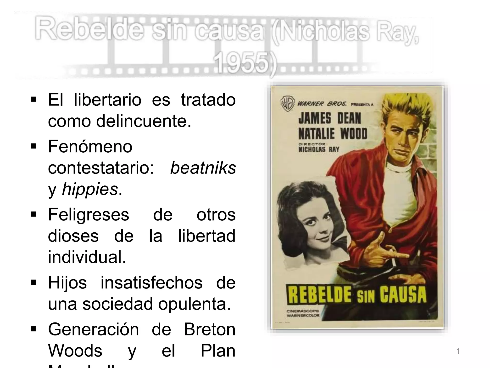 El documento resume la película Rebelde sin Causa de 1955, incluyendo que trata sobre jóvenes rebeldes y desarraigados en la era de posguerra, y el personaje icónico de James Dean. Explora temas como la búsqueda de identidad, la amistad, y el choque generacional con la sociedad autoritaria de la época.