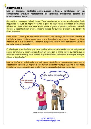 Este documento presenta varias actividades relacionadas con la adolescencia y los conflictos entre padres e hijos. La primera actividad pide pensar en palabras asociadas con la adolescencia. Las siguientes preguntas exploran temas como la rebelión adolescente, los principales conflictos con los padres y las razones por las que es más común en sociedades occidentales. Finalmente, se presentan algunos escenarios comunes de conflicto entre padres e hijos para su discusión.