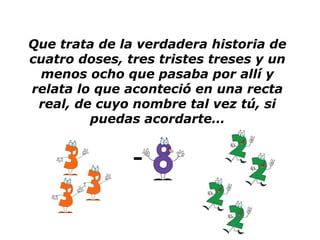Cuatro doses, tres treses y un menos ocho vivían felices en la recta real hasta que los radicales tomaron el poder e instauraron una dictadura. Los números enteros fueron encarcelados, pero lograron escapar utilizando sus conocimientos de matemáticas. Finalmente, todos los números se reconciliaron y vivieron en paz y armonía en la recta real.