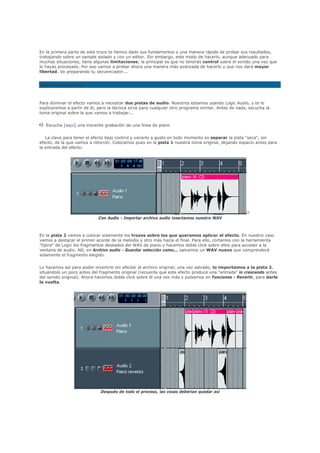 Este documento explica cómo crear un efecto de reverberación inversa en 3 pasos: 1) invertir una muestra de audio, 2) añadir reverberación a la parte invertida, y 3) invertir la muestra de nuevo. También propone una técnica avanzada que usa dos pistas de audio para tener más control sobre el efecto.
