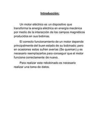 Este documento presenta un anteproyecto para rebobinar el motor monofásico de un estudiante. Explica que un motor eléctrico transforma energía eléctrica en mecánica a través de campos magnéticos producidos por sus bobinas. Cuando estas se queman, es necesario reemplazarlas para que el motor funcione correctamente nuevamente. Luego detalla los pasos a seguir para desbobinar y rebobinar el motor, incluyendo marcarlo, numerar las ranuras, diagramar las conexiones, cortar y pesar las bobinas, y