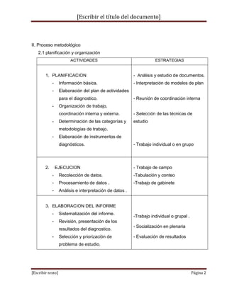 Este documento presenta el proceso metodológico para realizar un diagnóstico de la situación actual de la Unidad Educativa "Cota Cota". Se detallan los objetivos, justificación, proceso metodológico incluyendo planificación, población y muestra, instrumentos, y componentes del diagnóstico. El presupuesto es de 180 bolivianos.