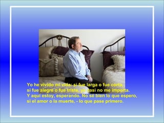El autor reflexiona sobre su vida, ya sea larga o corta, alegre o triste. Ahora espera, sin saber bien qué, el amor o la muerte. Aunque tuvo algo en el pasado y lo perdió, conserva un palacio de cristal en la luna y la compañía del viento. Lo que diga la gente ya no le importa, aunque reconoce haber cometido trampas y mentiras propias de su oficio de poeta. Esperará la muerte con una sonrisa, viviendo cada instante como una vida entera.