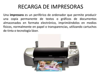 Este documento describe los diferentes tipos de tinta que se pueden usar para recargar cartuchos de impresora, así como las diferencias entre tintas a base de pigmentos y sales. Explica que las tintas a base de sales son más económicas pero menos resistentes al agua, mientras que las tintas pigmentadas son más caras pero más duraderas. También proporciona información sobre las herramientas necesarias para recargar cartuchos de tinta y el número de veces que un cartucho puede ser recargado de forma efectiva.