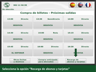 Este documento proporciona instrucciones para recargar un abono mensual mediante pago en efectivo. Los pasos incluyen seleccionar la opción de "Recarga de abonos y tarjetas", introducir los detalles del abono mensual, seleccionar "Efectivo" como forma de pago, verificar los detalles de la compra, introducir el importe, y finalizar la recarga.