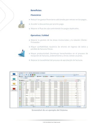 El documento describe un sistema de recepción de documentos contables que permite capturar y almacenar documentos de proveedores, extraer la información automáticamente y registrarla en el sistema financiero. El sistema ayuda a gestionar pagos de manera eficiente, mejorar la rentabilidad a través de alertas y monitoreo de pagos, y puede integrarse con un gestor de cuentas por pagar. Ofrece beneficios financieros como reducir gastos por retrasos en pagos y acceder a descuentos, y operativos como mejorar procesos, confi