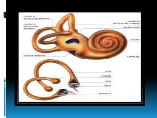 El documento explica el proceso de recepción del sonido a través del oído. Las vibraciones del sonido viajan a través del oído externo y medio, haciendo vibrar el tímpano y los huesos del oído medio, hasta llegar al oído interno. En el oído interno, los sonidos se transforman en señales nerviosas gracias al órgano de Corti, permitiendo que el cerebro reconozca y procese el sonido.